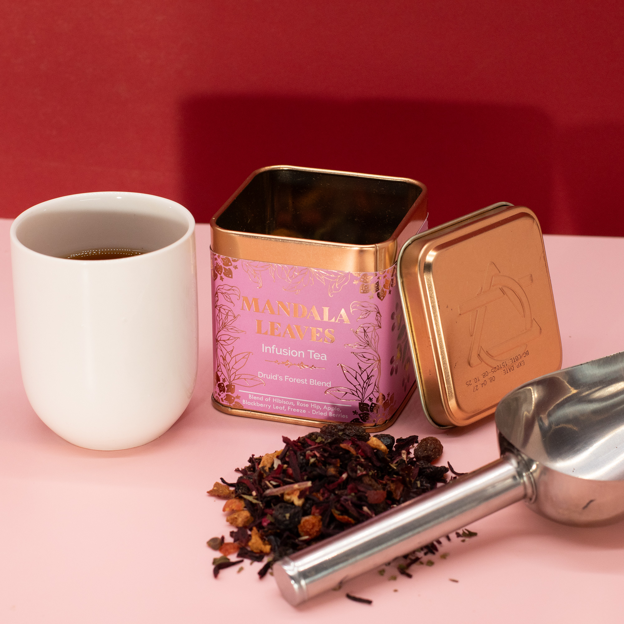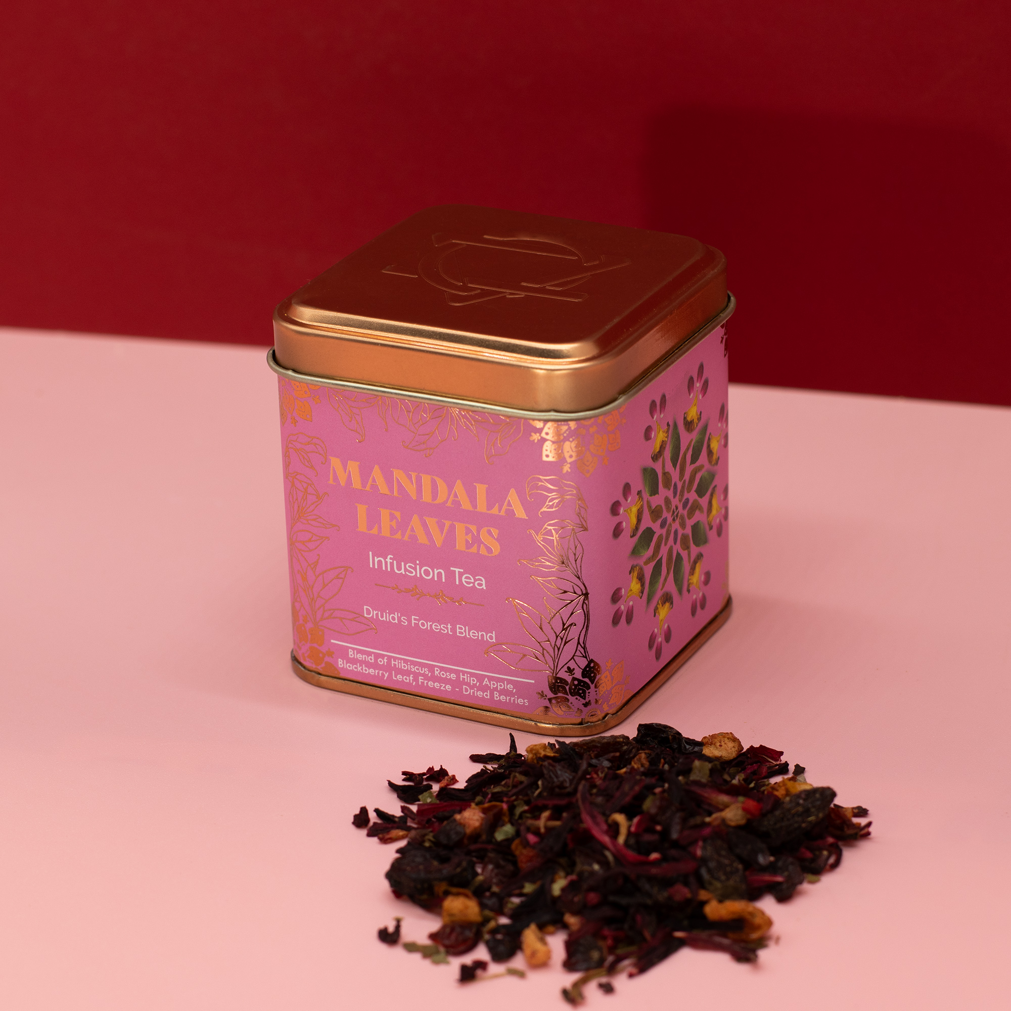 Cut hibiscus, rose hips, raisins (raisins, sunflower oil), corintas (corintas (99.5%), sunflower oil (0.5%)), apple (9%, apples (approx. 97.5%), salt, citric acid E 330, optional ascorbic acid E 300)), blackberry leaf, dried cherry (4%, cherries (79.0%), sugar and sunflower oil), freeze-dried raspberry (1.0%), freeze-dried strawberry (0 ' 5%), lyophilized blackberry (0.5%), aroma
