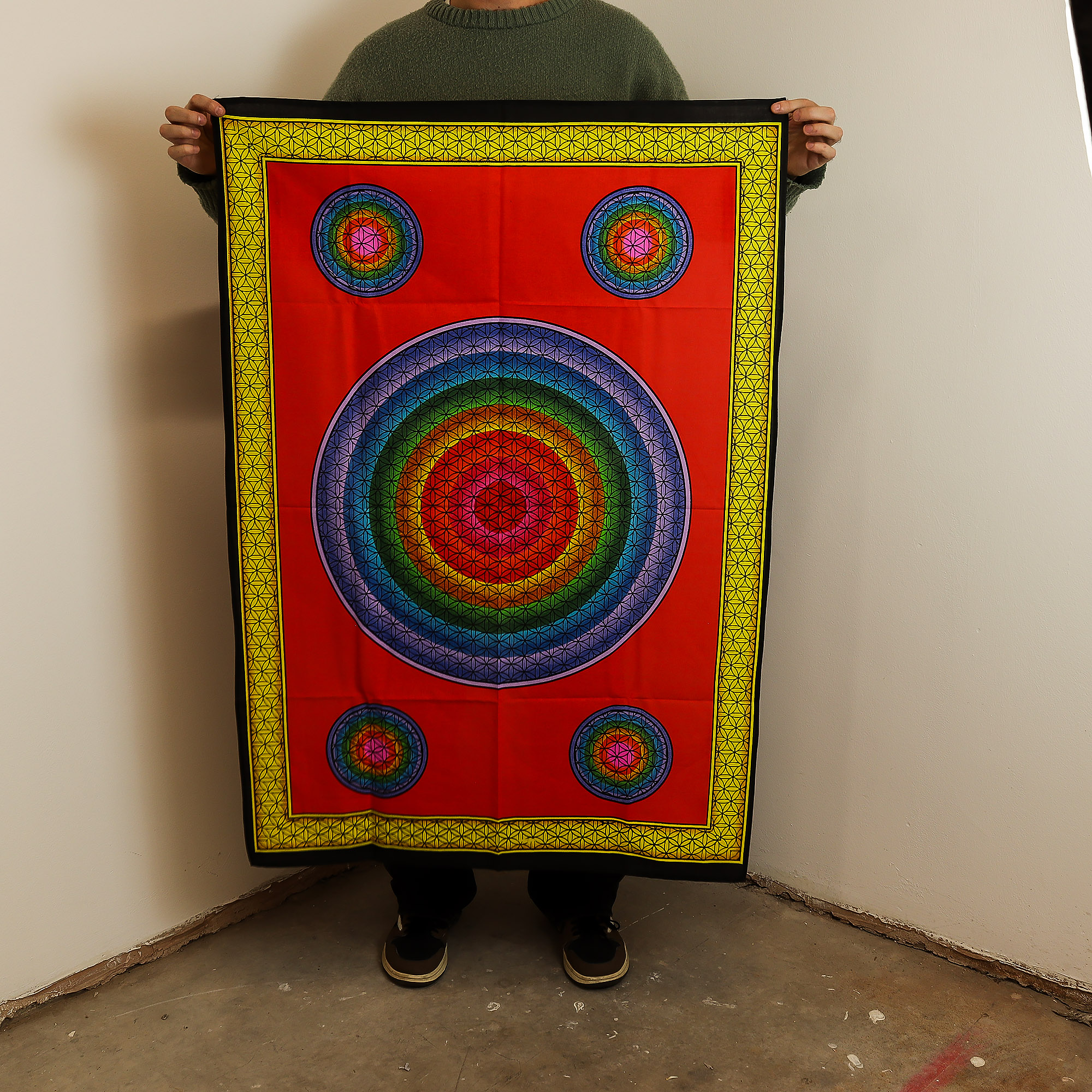 Para uso en interiores. Cuélguelo en la pared con clavos, ganchos, cinta adhesiva o una barra decorativa. También puede usarse como manta decorativa, paño de meditación, fondo para fotos o separador de ambientes.