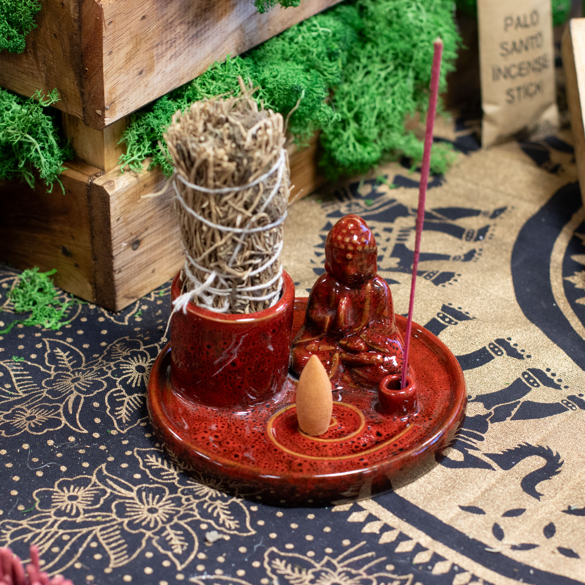 Coloque el plato de incienso sobre una superficie plana, estable y resistente al calor. Introduzca con cuidado la varilla de incienso, el atado de salvia o el palo santo en el soporte integrado. Encienda el extremo del incienso y apague la llama, dejando que el humo se disperse lentamente. La base circular recoge las cenizas, manteniendo la zona limpia durante su uso. Después de usarlo, deje que se enfríe completamente antes de manipularlo o limpiarlo.